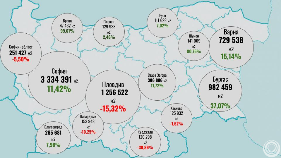 Област Бургас се откроява с най-динамично развитие. Стартираните площи достигат 982 хил. кв. м, което е увеличение от 37% и най-високият обем от 2008 г. насам. Основните двигатели са мащабните жилищни проекти и отчетливото възстановяване на ваканционното строителство по Южното Черноморие.
