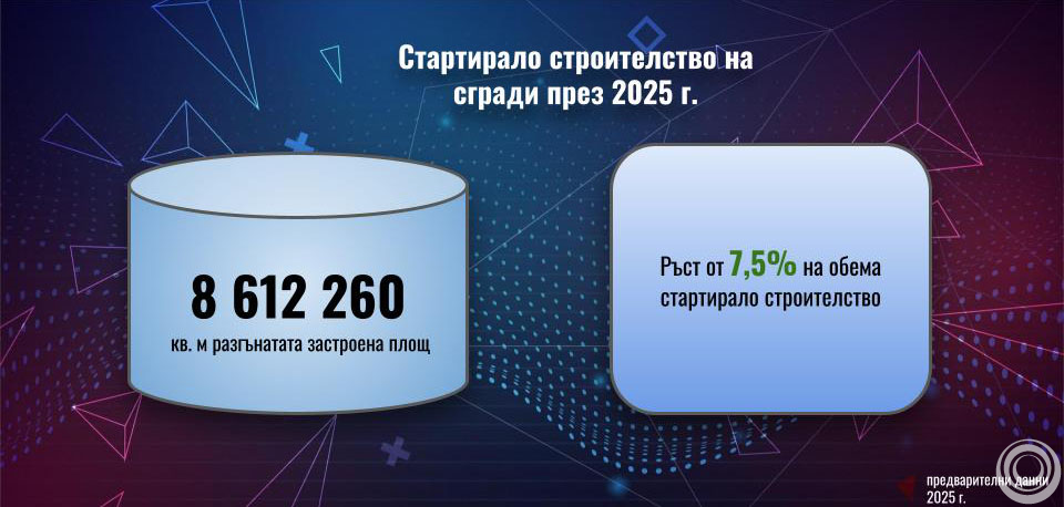 Строителният сектор в България отчита изключително силна година, като предварителните данни за 2025 г. показват рекордни обеми на стартирано строителство. Общата разгъната застроена площ (РЗП) на започнатите сгради достига 8 612 260 кв. м, което представлява ръст от 7,5% спрямо предходната година.